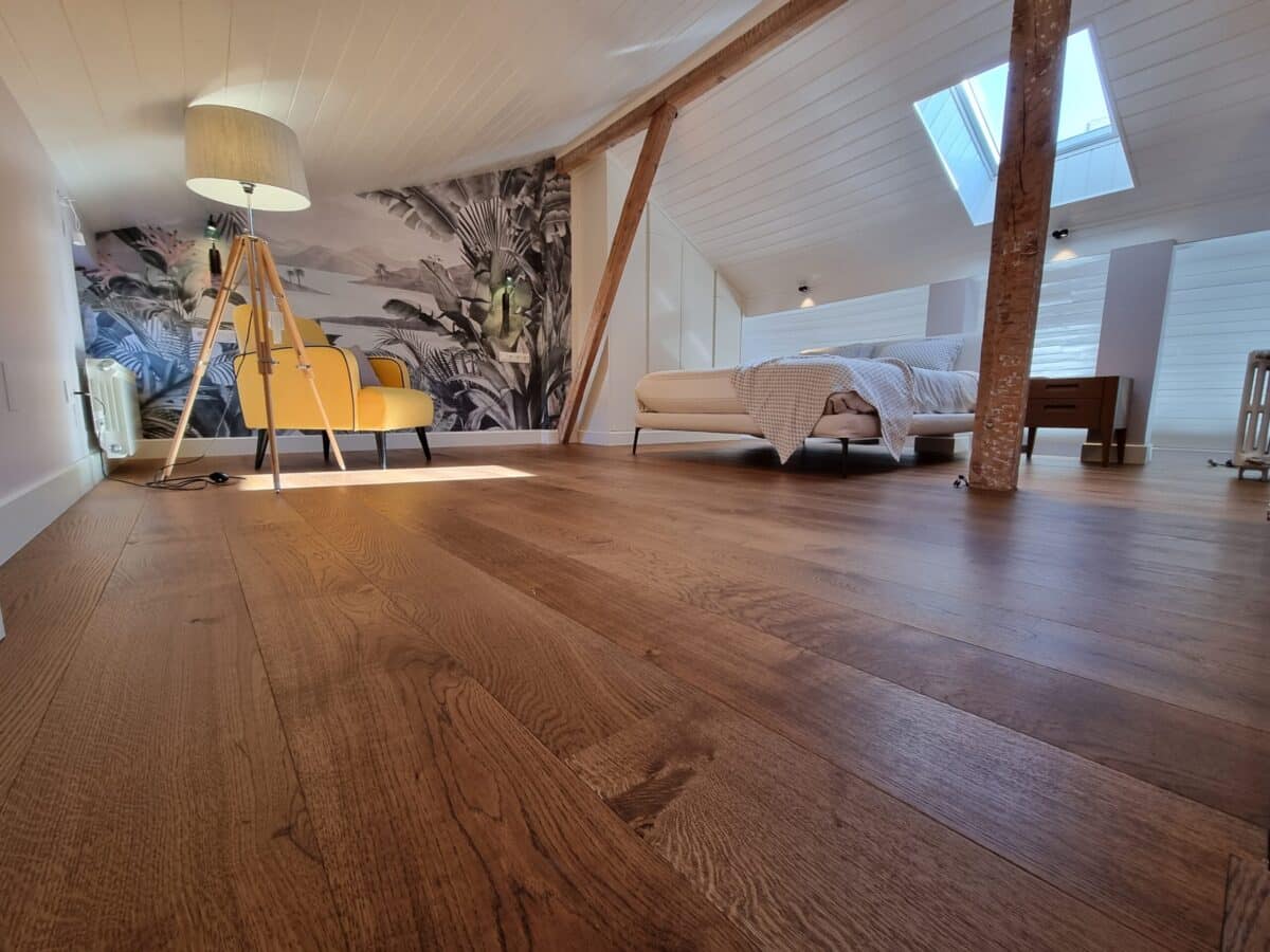 Fumé IMA Rústico Roble 1 Lama – Tarima flotante de Roble de madera natural barnizada, calidad rústica, cepillada y microbiselada. Acabado barniz extra-mate, con un grosor de 14mm y 3,8mm de capa noble de madera.