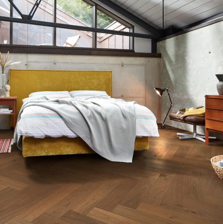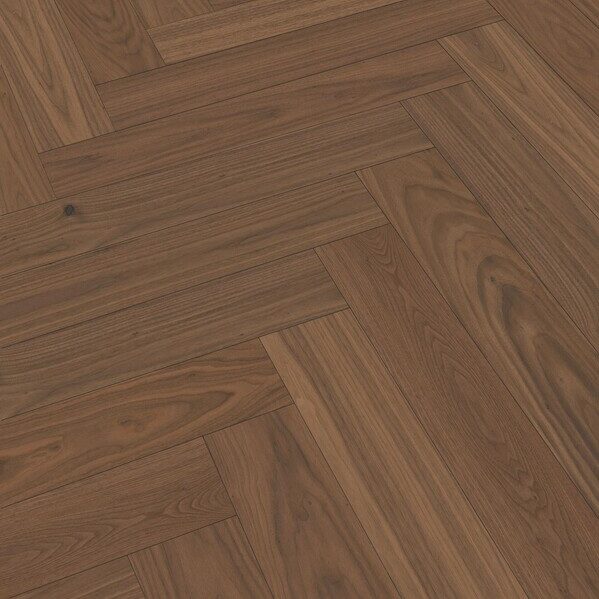 Nogal Americano Clásico MEISTER Lindura HS 500 8924 – Nuevo formato en espiga de lamas cortas siguiendo los patrones de colocación clásico formando ángulos de 90º. Se presenta en una superficie antibacteriana y con un barnizado ultramate que impregna en profundidad los poros, aportando de este modo una protección frente a las manchas, por lo que es mucho más fácil de cuidar. Efecto antihuellas de manos y pies, y resistencia a los microarañazos y al desgaste (pequeños arañazos que puedan producirse en la superficie que no penetran en la madera auténtica). Microbisel a 4 lados simulando un suelo de apariencia más continua. Instalación sencilla gracias al sistema clic UniZip patentado, para el que solo es necesario un único tipo de tablón.